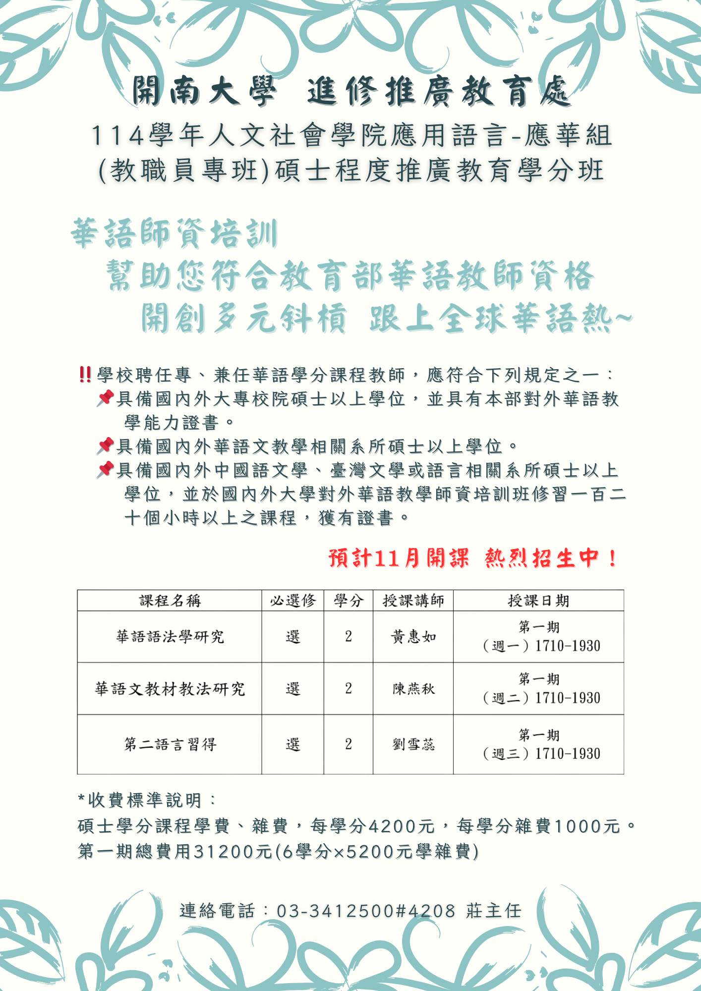 費用說明: | 碩士學分課程學費、雜費:每學分費4,200元。每學分雜費1,000元。 第一期總費用:31,200元(6學分X 5,200學雜費) | ||
